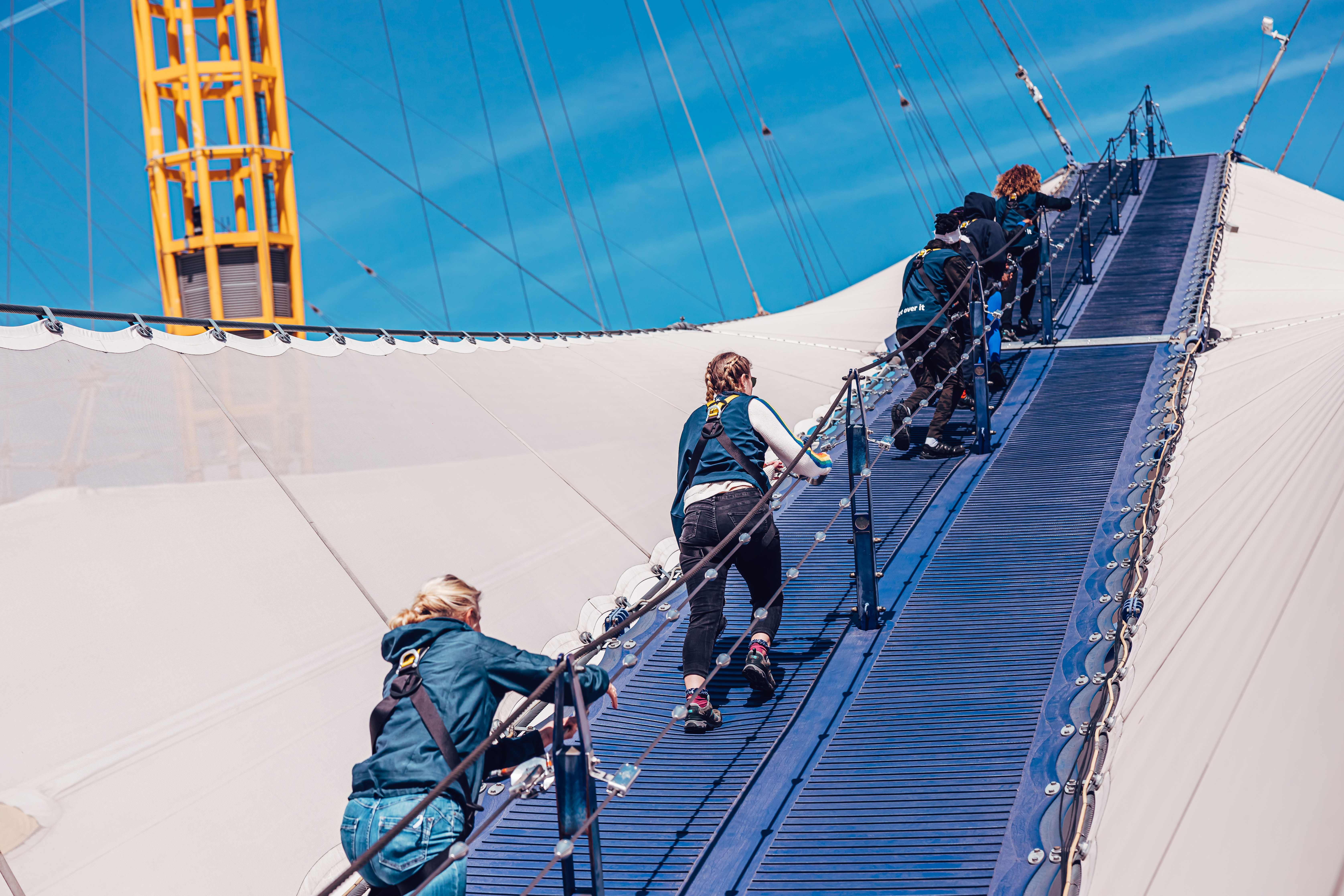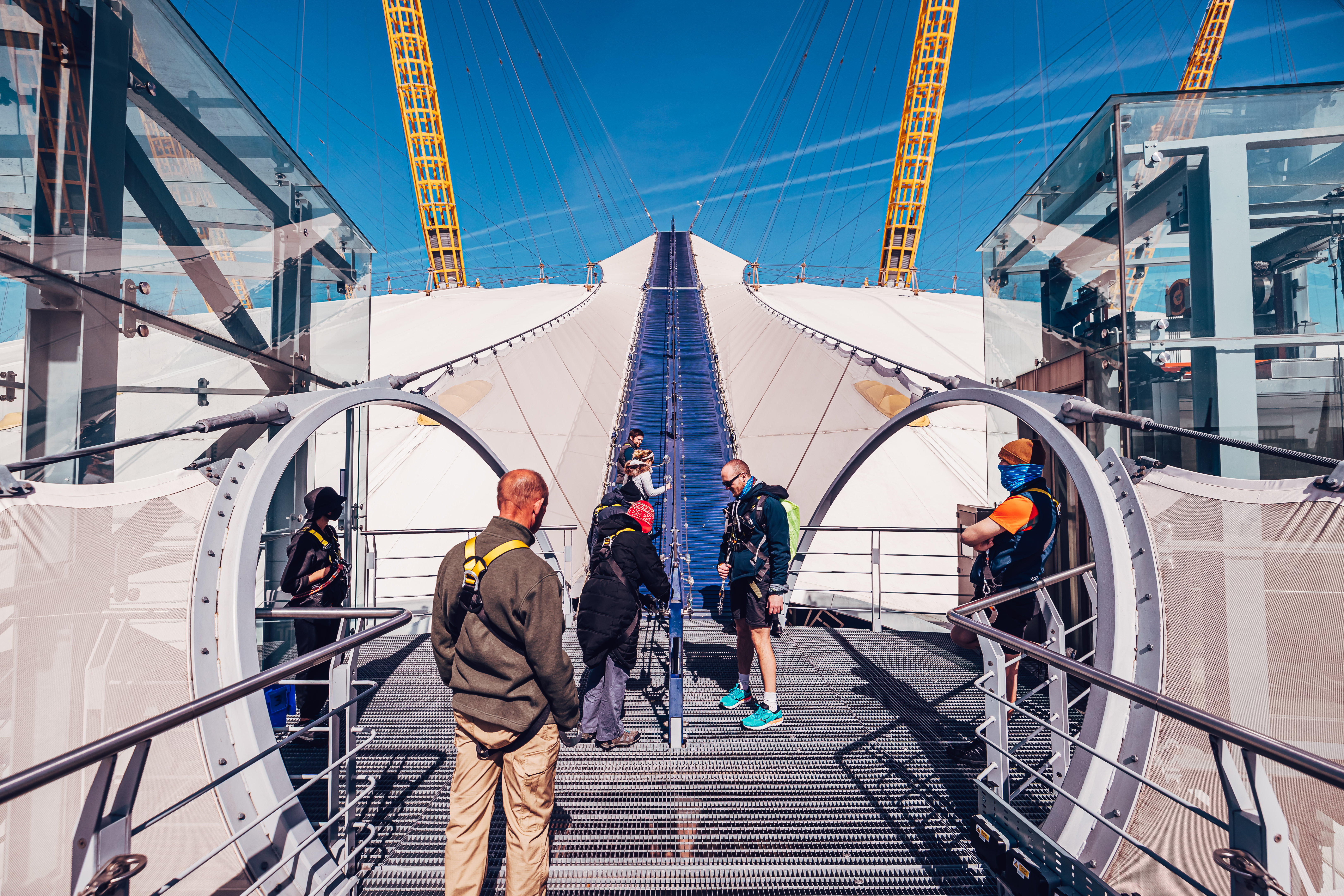 At its steepest point the walkway has an incline of 28° on the way up and 30° on the way back down and has a slight bounce to it to replicate the surface of the tent. There's a hand rail on the walkway and a balustrade on the observation platform. Before you climb, you'll meet your Climb Guide who'll take you through everything you need to know and give you a climb suit, shoes (if necessary) and a safety harness. You'll then make your way onto the walkway, via a short set of stairs, or lift, to the base of the tent ready to start your climb. There is an observation platform at the summit where you can take in spectacular 360° views of London and its many landmarks. Once on the platform you will be able to move freely to enjoy the views before your descent. At all other times you'll be attached to the climb system on the walkway to keep you safe and your Climb Guide will be nearby to help you and answer any questions.
